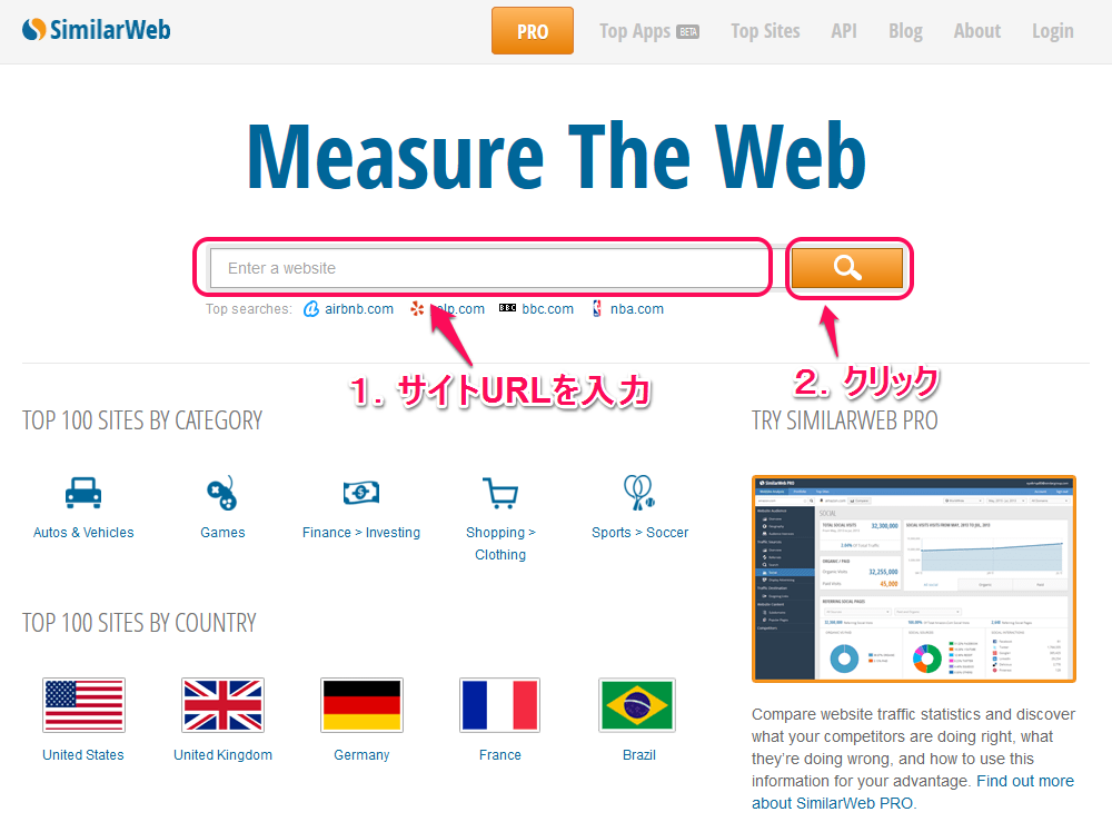 サイトトップの「TRY SIMILARWEB PRO」からリンクをクリックすると有料版のページが出てきます。