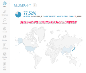 これで見ると日本国内で77.52%を占めていますが、海外からのアクセスも23%近くあることが判ります。