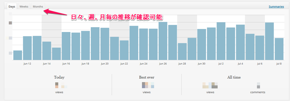 Summariesをクリックする事で週単位、月単位、半年単位、年単位、Jetpack導入時等、過去のデータを確認する事が出来ます。